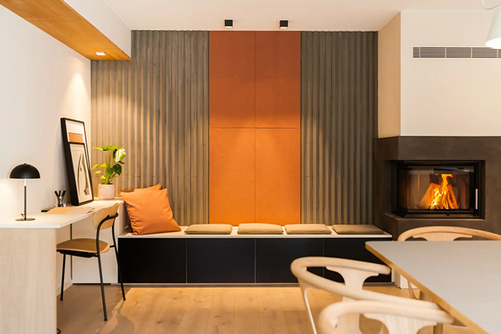 1. Himlingen over trappen er malt med LADY Perfection i fargen 2856 Warm Blush – og kjøkkenskap er malt i samme farge, men med LADY Supreme Finish. 2. Feltet i midten er laget av treplater som er polstret med mykt, terracottafarget stoff som er komfortabelt å lene seg inn til. 3. Den integrerte hylleseksjonen er malt med LADY Supreme Finish Halvblank i fargen 8252 Green Harmony – og hyllene har fått fargen 2856 Warm Blush.