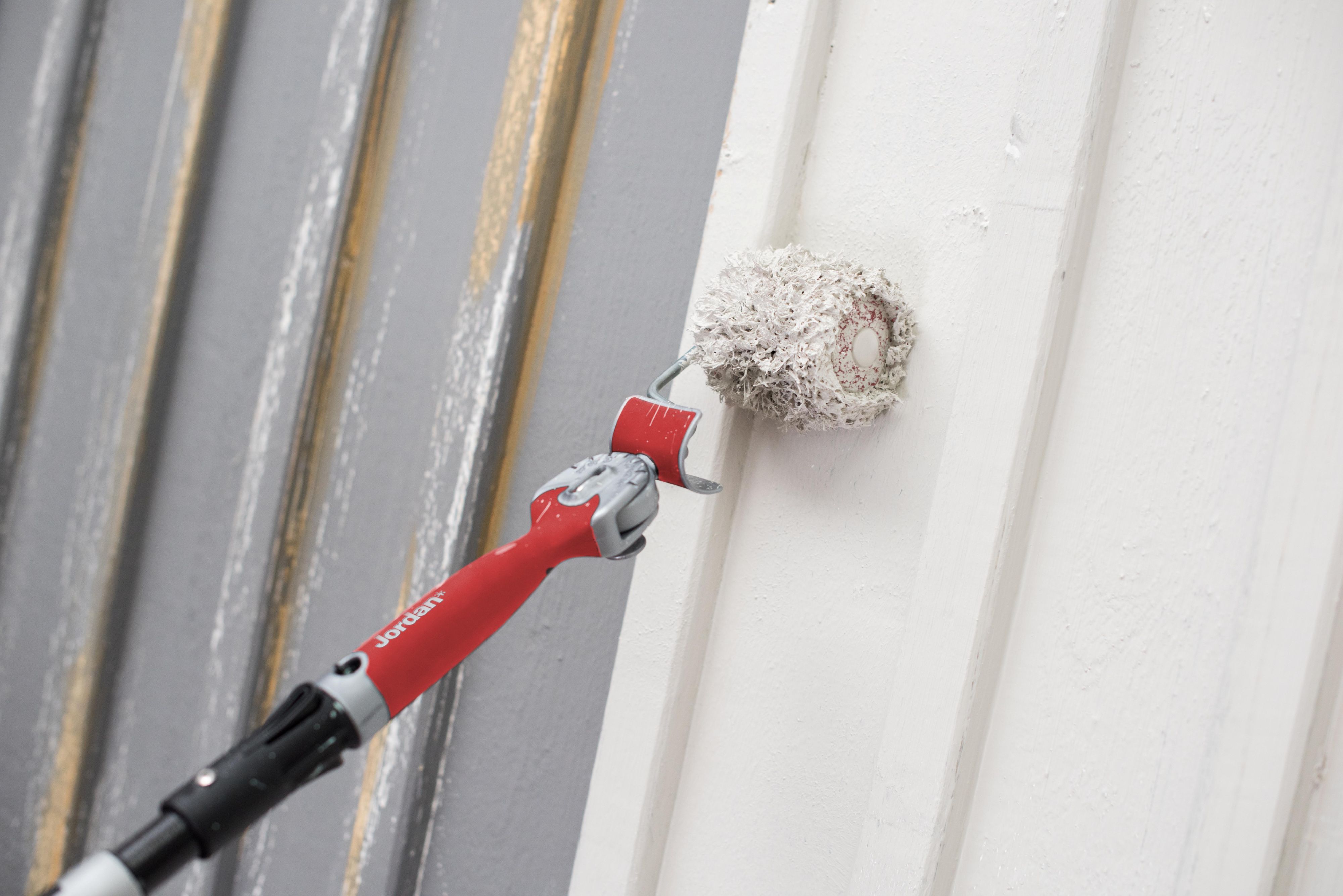 Bruk forlengerskaft. Ved å sette både rull og pensel på langt skaft, øker du rekkevidden betraktelig både i høyden og til sidene, og du kan male en mye større flate uten å bøye og strekke deg for mye. Det er også mye bedre for kropp og rygg.