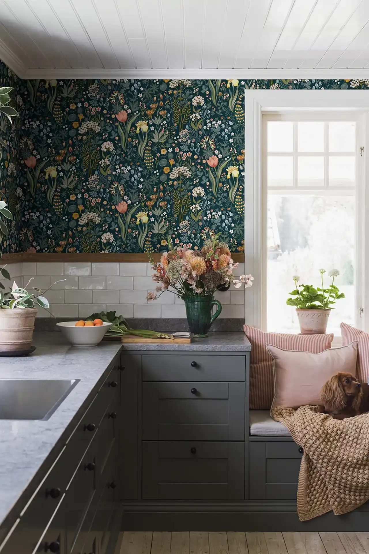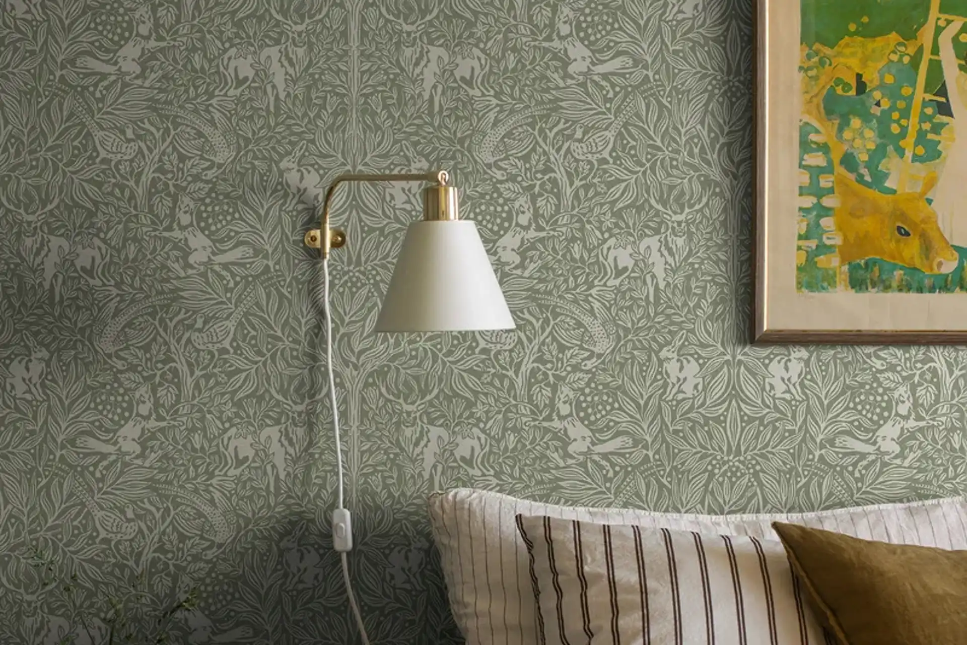 Under the Elder Tree er en mønstrete tapet som passer både store og små. På avstand danner svarthyllens tette bladverk en rolig, helhetlig overflate. Ser du nærmere etter, oppdages de lekne detaljene som den stolte kronhjorten og fasanene som flykter fra reven i hagtornen.