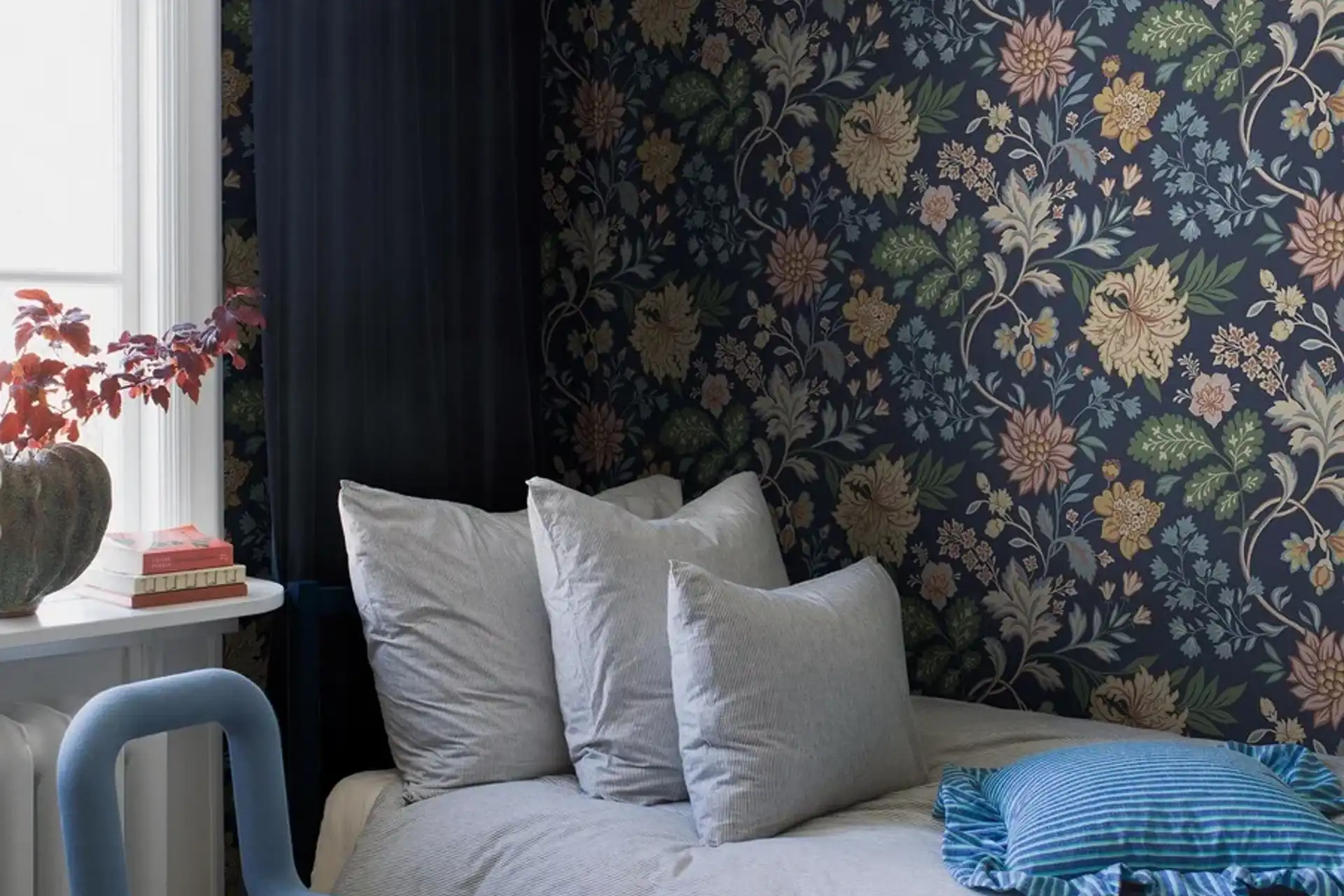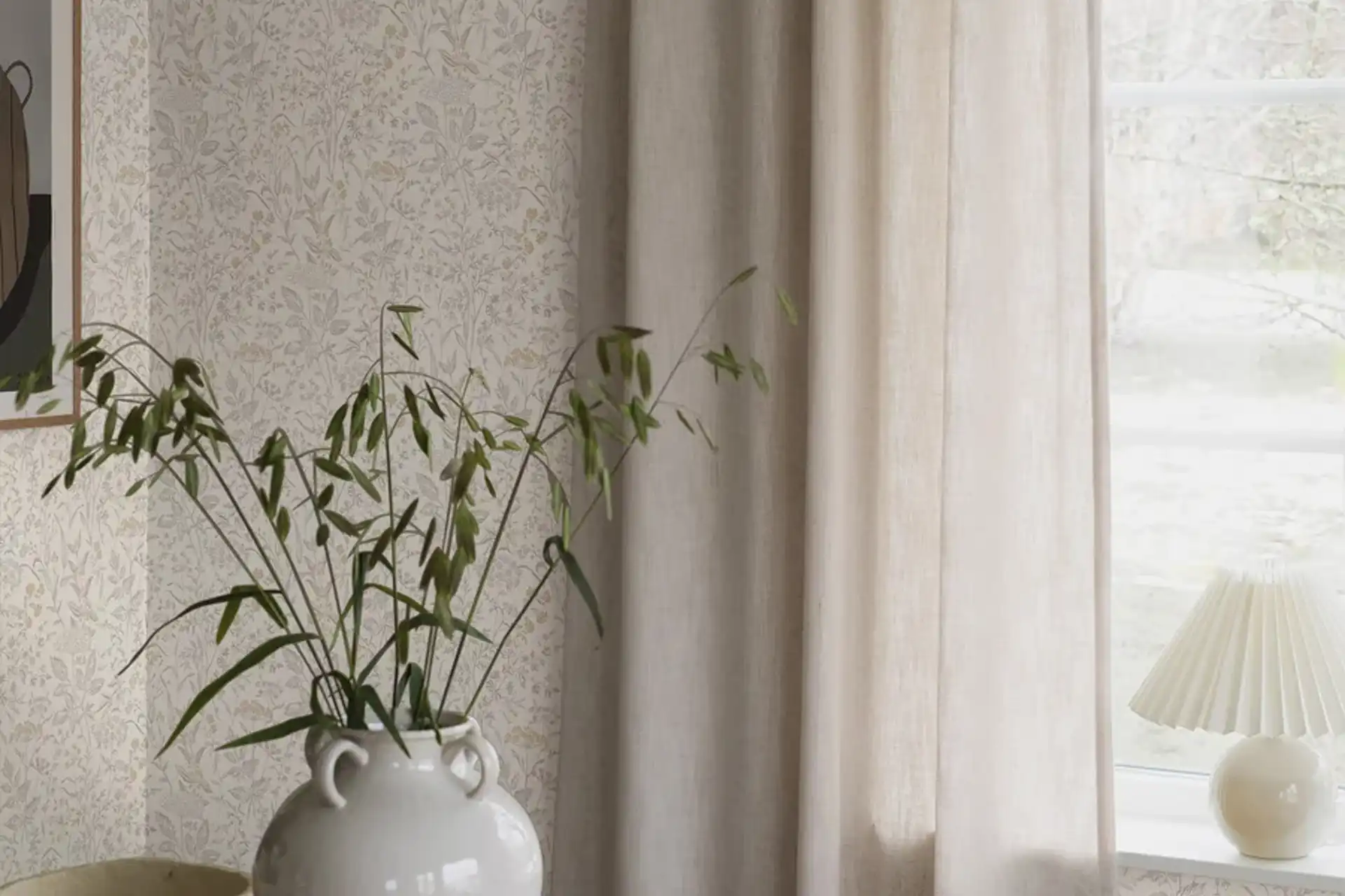 Sigrid prydes av et akvarellmønster av bregner og andre vakre blad, slyngende over lys bunn. Et klassisk tapetmønster som gjør seg fint både i moderne og mer tradisjonelle miljøer.